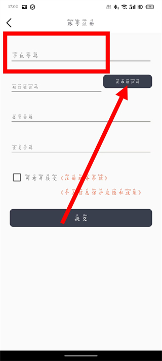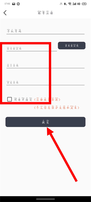 4、依次设置登录密码、确认密码,勾选后,点击提交按钮,完成账号注册。