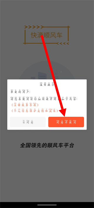 1、打开快滴顺风车,在弹出的弹窗中点击同意并使用,进入登录界面。