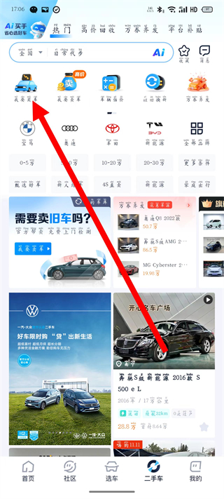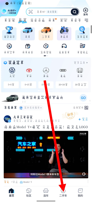 1、打开汽车之家,点击底部导航栏的二手车,进入二手车页面。