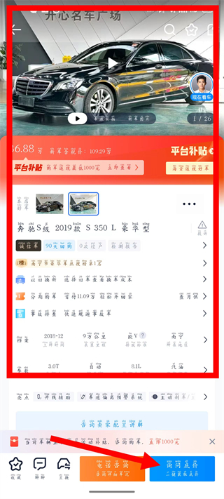 4、在车型详情页,点击咨询底价或电话咨询按钮,进一步了解车辆信息及购车价格。