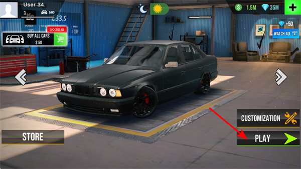 1、进入游戏后,点击PLAY按钮,这是开启赛车挑战的关键操作,点击后可进入游戏模式选择界面,开始赛车冒险。