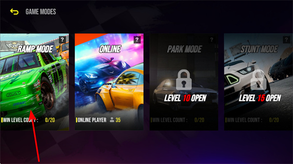 2、选择RAMP MODE游戏模式,这是体验特技赛车的核心操作,选择后可参与坡道特技挑战,积累关卡进度。