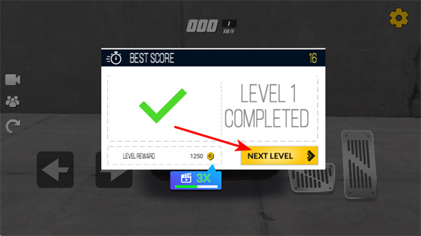 4、关卡完成后点击NEXT LEVEL按钮,这是推进游戏进程的基础操作,点击后可进入下一关,挑战赛车特技。