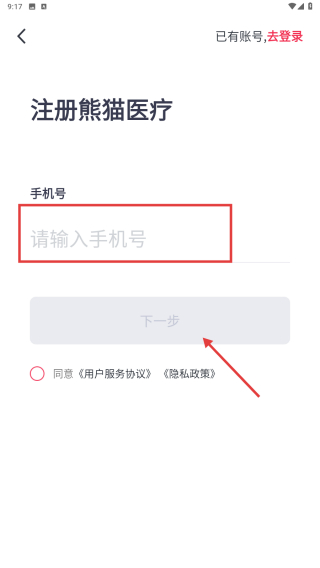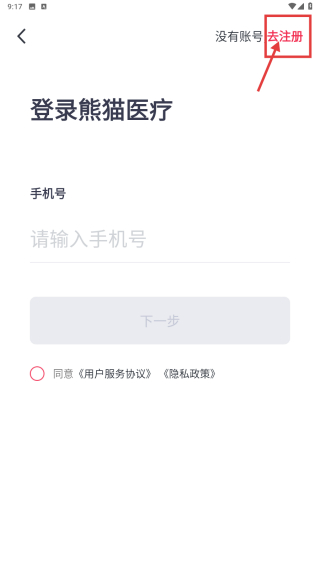 4、在注册页面,输入手机号后点击下一步,完成账号注册操作。