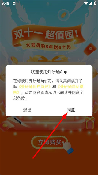 1、在欢迎使用外研通App弹窗中,点击同意,进入页面。
