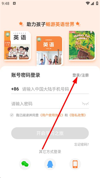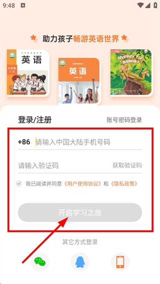3、输入中国大陆手机号码,并输入验证码,点击开启学习之旅,完成账号登录。