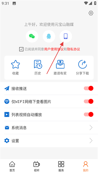 1、打开元宝山融媒,点击页面右下角我的,可进入个人中心页面。