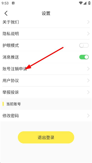 3、在设置页面,点击账号注销申请,进入账号注销申请页面。