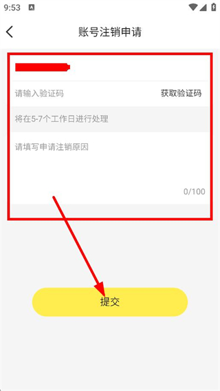 4、在账号注销申请页面,输入验证码,填写注销原因后点击提交,完成账号注销申请。