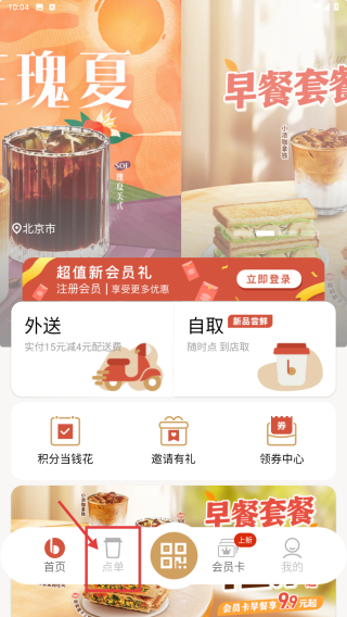 1、打开咖啡类应用,点击底部点单选项,进入堂食/外带页面。
