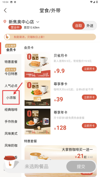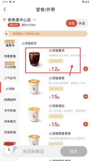 2、在堂食/外带页面,点击小浓咖分类选项,浏览小浓咖系列商品列表。