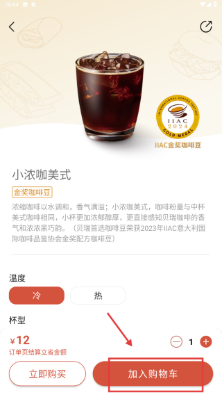 3、在商品列表里,找到小浓咖美式商品条目,点击进入商品详情页。