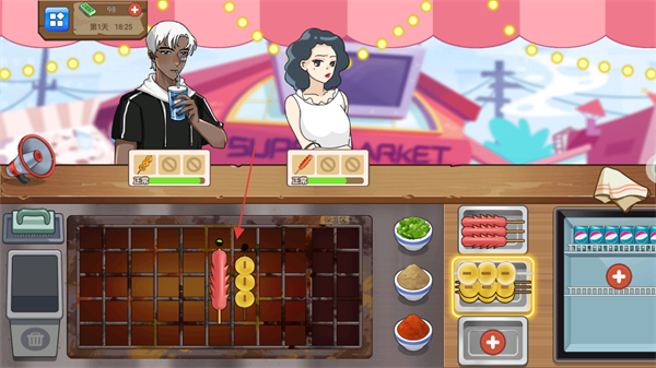 初始菜单仅有基础烤串,随着经营推进可解锁烤蔬菜、烤海鲜等更多品类,满足不同顾客的口味需求,提升收益。