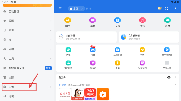 1、打开文件管理类应用,点击左侧设置选项,进入设置页面。