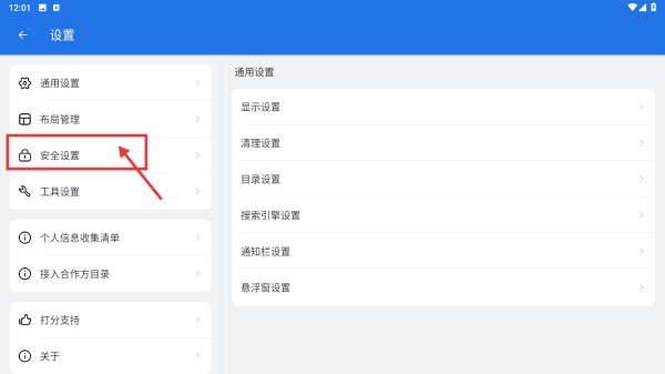 2、在设置页面,点击安全设置选项,进入安全设置页面。
