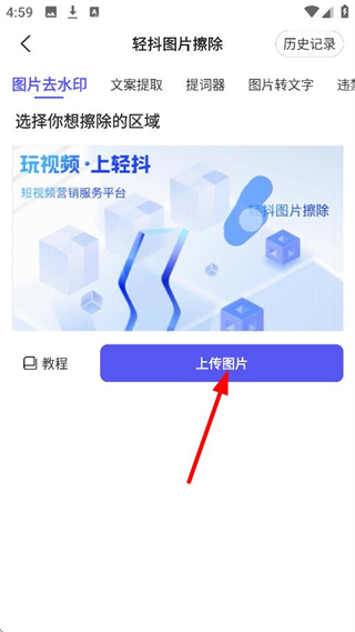 2、在图片擦除页面,点击上传图片,选择目标图片。