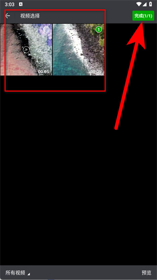 2、在视频选择界面,选择视频后,点击右上角完成。