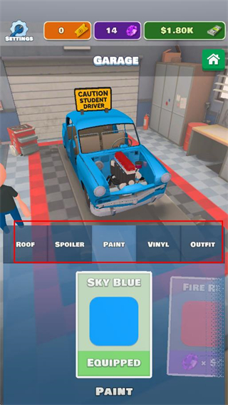 3、进入车库自定义赛车的车顶、尾翼、喷漆等外观。