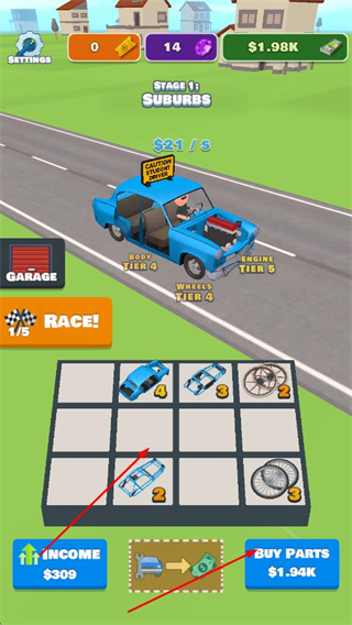 1、点击BUY PARTS,花费金币购买汽车零件,丰富零件库存。