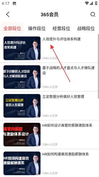 涵盖HR公开课、系统课程、考证精讲等多类型学习内容,覆盖招聘配置、薪酬绩效、员工关系等全模块,课程由行业专家打造,适配不同阶段从业者学习需求。