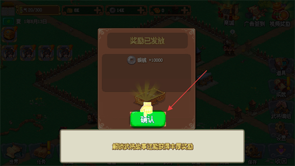 3、解锁武将故事后领取奖励如铜钱,积累游戏资源。