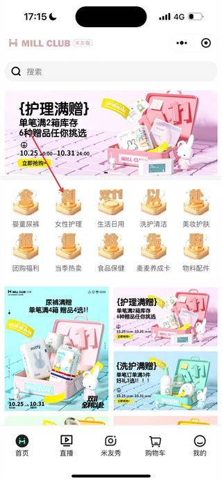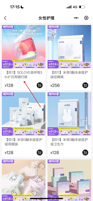 1、打开米友圈,点击女性护理,可进入女性护理商品列表页面。