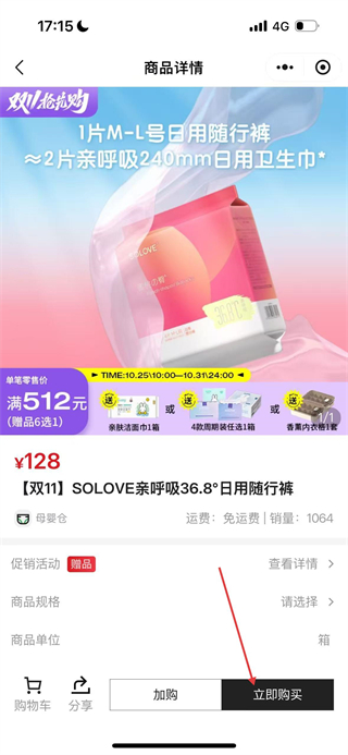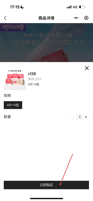 3、在商品详情页面,点击立即购买可进入商品规格选择页面。