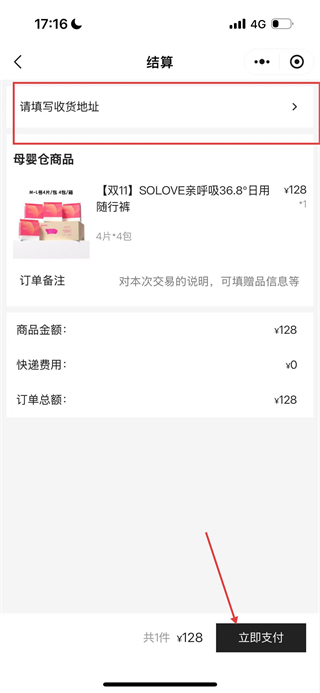5、在结算页面,填写收货地址后点击立即支付可完成商品购买。