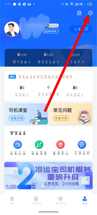 1、打开冷运宝,点击我的页面,右上角设置图标,进入设置页面。