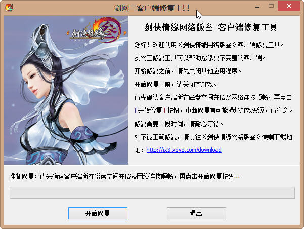 剑网三客户端修复工具是一款剑侠情缘3客户端修复器工具,帮助您修复不完整的客户端,开始修复之前请先关闭其他应用程序和关闭本游戏!