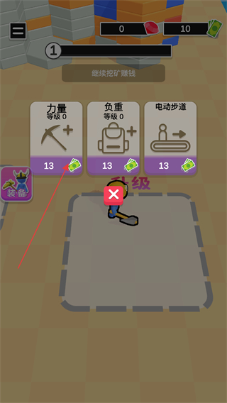 2、可以在升级方块内,利用挖矿赚的钱来升级角色的力量和负重属性,或是添加电动步道。