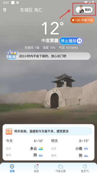1、打开天气类应用,点击右上角我的选项,进入个人中心页面。