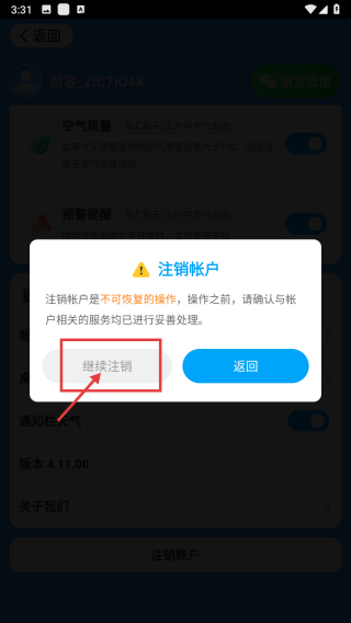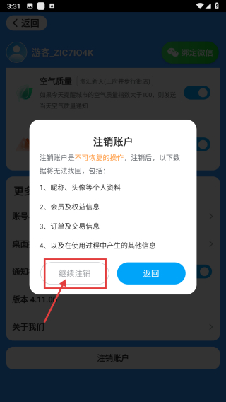 4、在后续弹出的确认框中,再次点击继续注销按钮,发起账号注销操作。