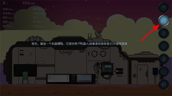 2、点击建筑按钮,可进入建筑菜单,建筑是发展基地、获取资源的基础,需优先建设关键模块。