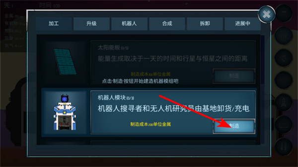 3、在建筑菜单中,点击制造可生产机器人模块,机器人能提供资源收集和探索能力,助力发展。
