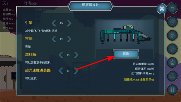 4、进入航天器设计界面,点击建造可打造航天器,航天器是探索深空,需根据需求升级部件。