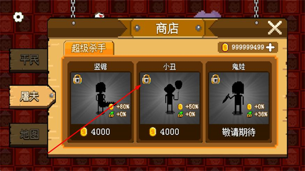 3、切换到屠夫分类,可解锁竖锯、小丑等屠夫皮肤,需花费对应金币解锁。