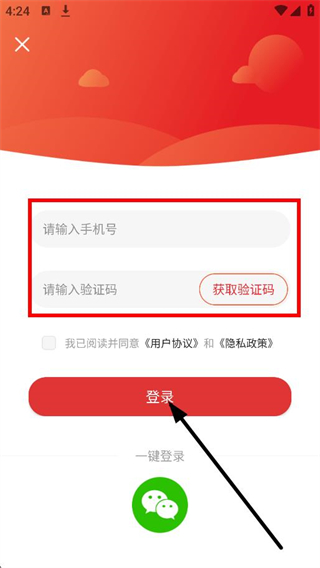 4、输入手机号,输入验证码,点击登录,完成账号登录操作。