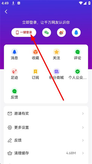 2、在个人页面,点击一键登录,进入手机号登录页面。