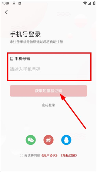 3、在手机号登录页面,输入手机号码,点击获取短信验证码。