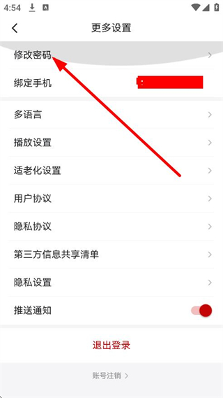3、在更多设置页面,点击修改密码,进入修改密码页面。