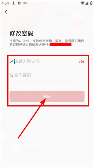 4、在修改密码页面,输入验证码和新密码后点击完成,完成密码修改操作。