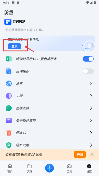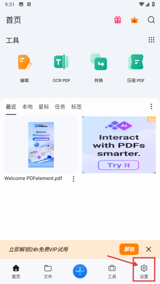 1、打开PDF处理类应用,点击底部设置选项,进入设置页面。