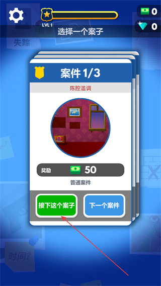 1、在选择一个案子界面,点击接下这个案子,开始处理案件,如案件1腔腔盗调,完成后可获得金币奖励。