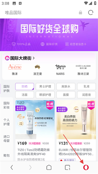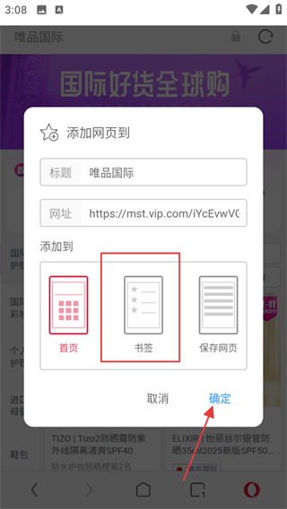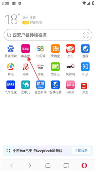 1、打开欧朋浏览器,在首页点击唯品会,可进入唯品国际页面。