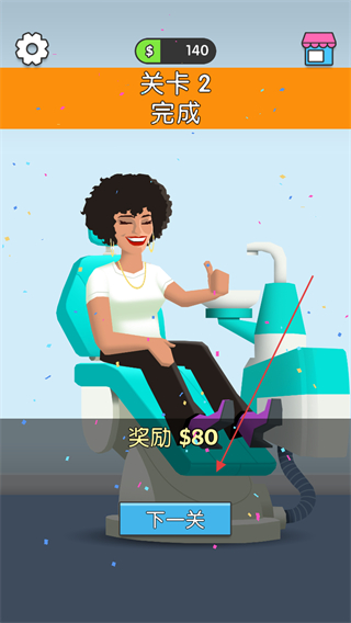 4、关卡完成,获得金币奖励,点击下一关继续为新患者治疗牙齿。