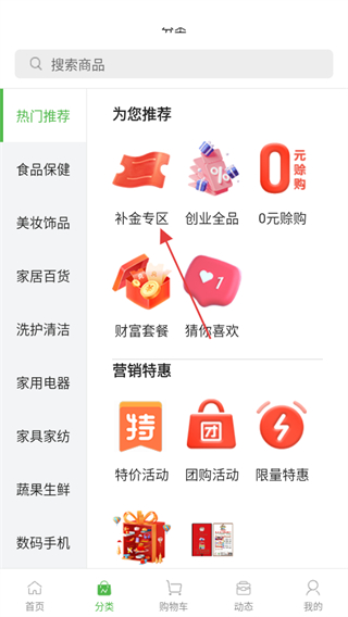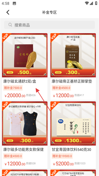 2、在分类页面,点击补金专区可进入补金专区商品页面。