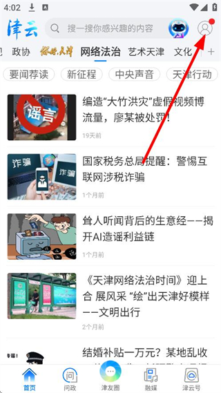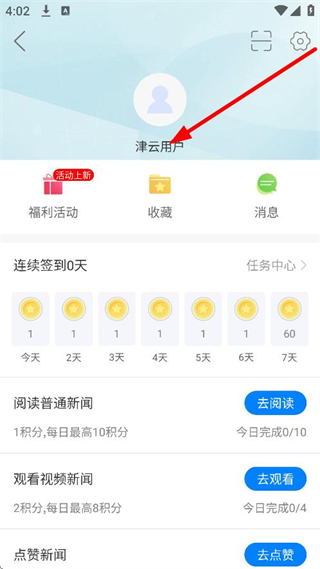 3、在个人页面,点击津云用户,进入注册/登录页面。
