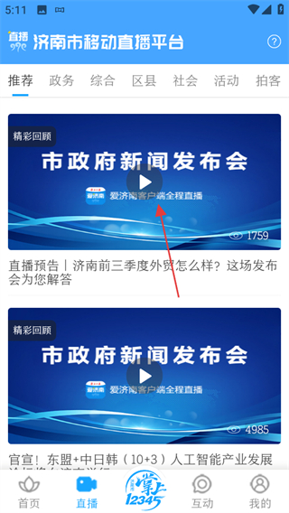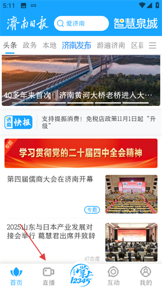 1、打开爱济南,在首页点击直播,可进入直播分类页面。