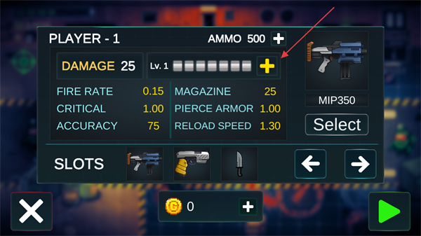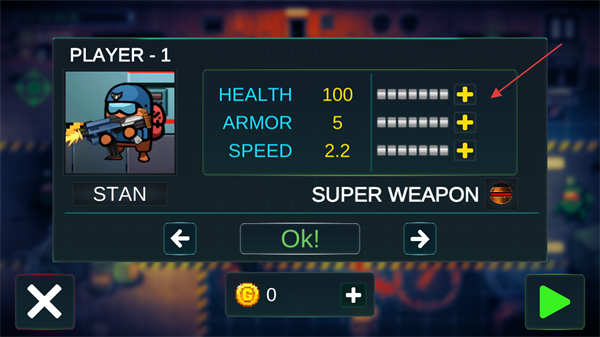 2、选择玩家1的角色,点击右边的小加号可以花费金币提升角色属性。